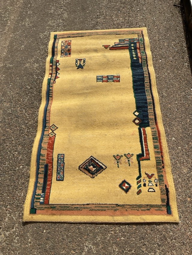 A Belgian rug woven with abstract geometric motifs on a butter yellow field, within a conforming border. (58in x 32in)