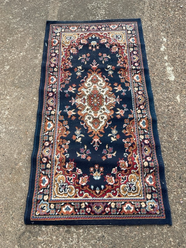 A Belgian rug woven with scrolled foliate medallion and conforming spandrels amid scattered floral sprays on a blue field, within meandering blossoming vine borders. (59in x 30in)