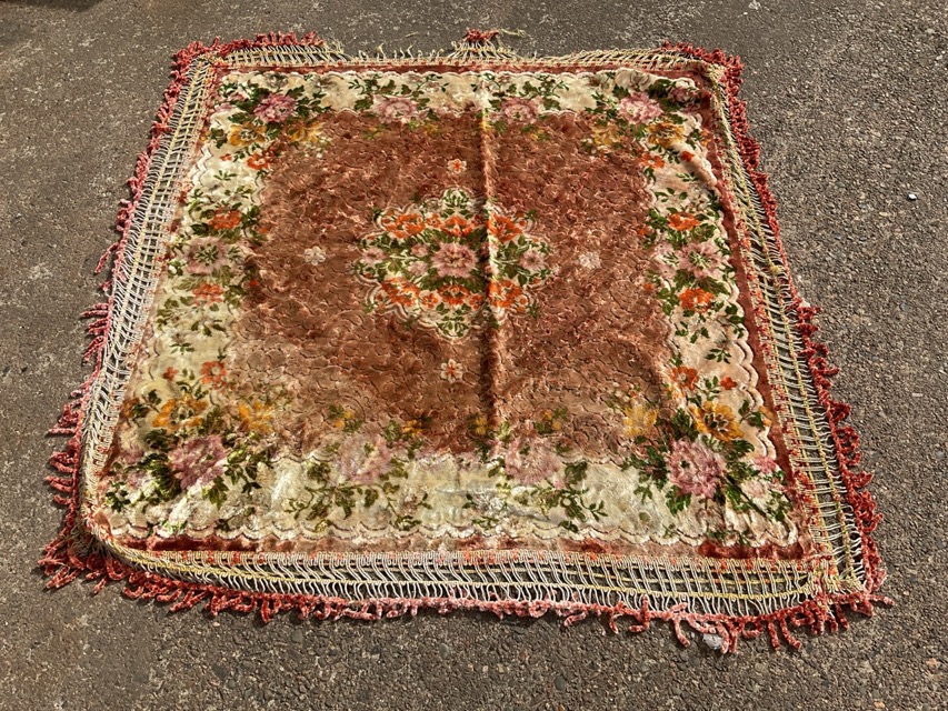 An Italian cut velvet table cover with floral medallion on a café-au-lait field of scrolling foliage, within a floral border and knotted chenille fringe. (54in x 54in)