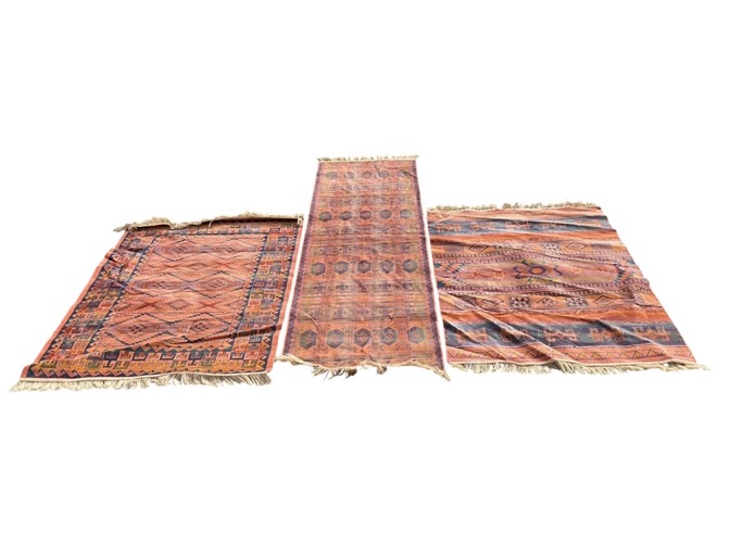 A Persian style runner woven with bands of geometric motifs on brick red ground - 87in x 26.75in; and two similar rugs, woven with lozenge motifs within geometric borders - 53in x 39in. (3)