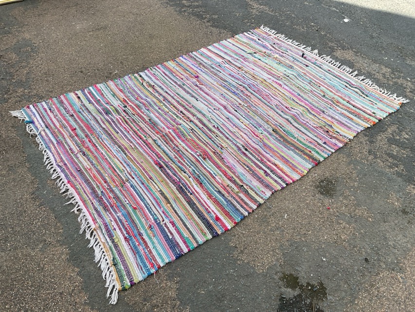 A South African rag rug woven in strung multicoloured bands, having knotted tassled ends. (56.5in x 79in)