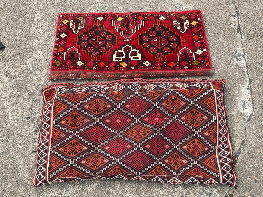 A Moroccan flatweave carpet bag woven with lozenge lattice on black field within a diamond border - 23in x 46in; and an Afghan wool cushion bag with hexagonal floral medallions and ziggurat motifs on a red field, within flowerhead borders - 21in x 42.5in. (2)