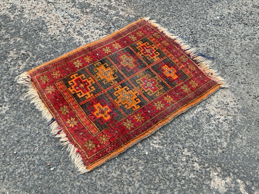 A small Anatolian wool rug woven with two rows of hooked cruciform motifs on a charcoal field, within flowerhead and chequered borders. (17.5in x 21.5 in)