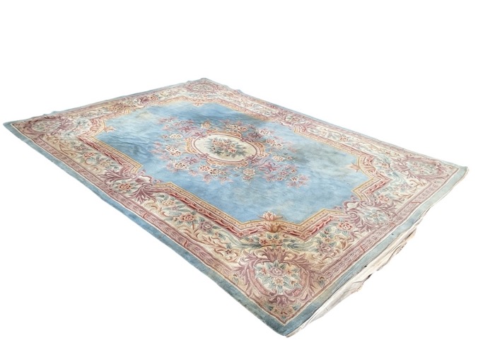 A Chinese Aubusson style wool carpet with oval floral medallion on a blue field within formal floral and foliate borders. (108in x 147in)