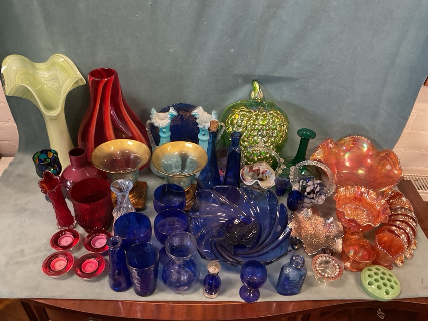 Miscellaneous coloured glass - vases, art glass, a thistle engraved decanter, carnival glass, Bristol blue, a pair of satin glass enamelled ewers, bowls, etc. (A lot)