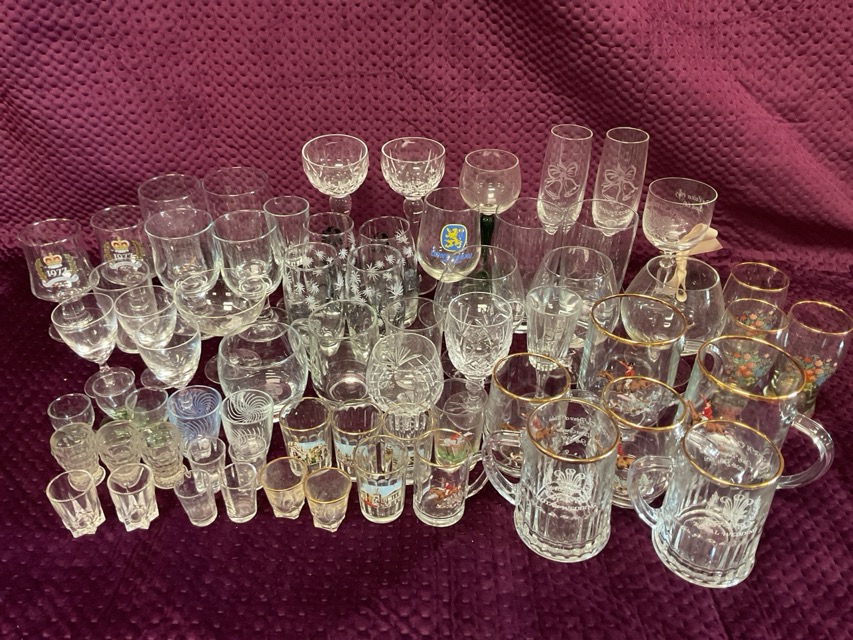 Miscellaneous drinking glasses - tankards, sets, enamelled & engraved, wine glasses, tots, etc. (A lot)