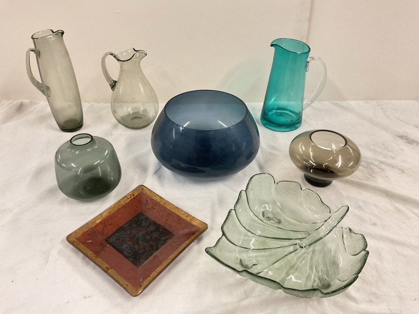 Miscellaneous Scandinavian glass - smoked glass jugs & bowls, a signed square platter, a large blue bowl, a turquoise jug, a leaf shaped bowl, etc. (8)