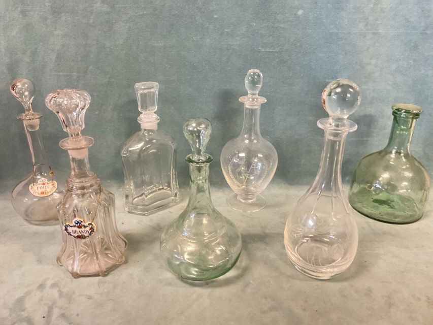 Seven miscellaneous decanters & stoppers - engraved, mallet shaped, two with enamelled Port & Brandy labels, lobbed, etc. (7)