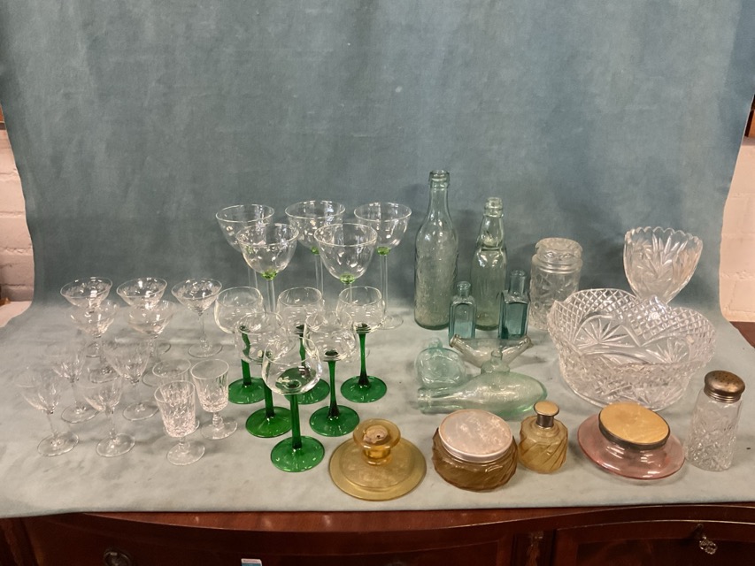 Miscellaneous glass - sets of glasses, a cut glass fruitbowl, five tall signed art glass wine goblets, dressing table pots, dug-up type bottles - torpedo, Stourbridge, Worcester, North Berwick, etc. (A lot)