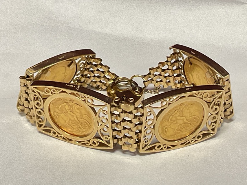 A 9ct gold bracelet set with four half sovereigns in panels - 1904, 1905, 1908 & 1914, joined by gate links with padlock safety chain. (39.9g)