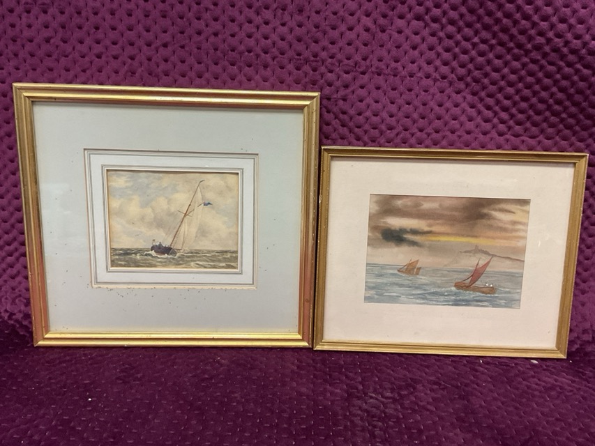 Victorian watercolour, sailboat on choppy seas, signed indistinctly, mounted & framed; and another later watercolour, two sailboats at sea with distant castle, mounted & framed. (2)