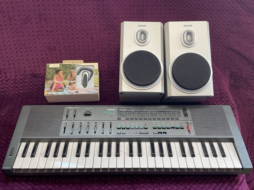 A Yamaha PortaSound Mk-100 tabletop electronic keyboard; a pair of Philips stereo speakers; and a boxed T-Mobile S21 Bluetooth headset. (3)