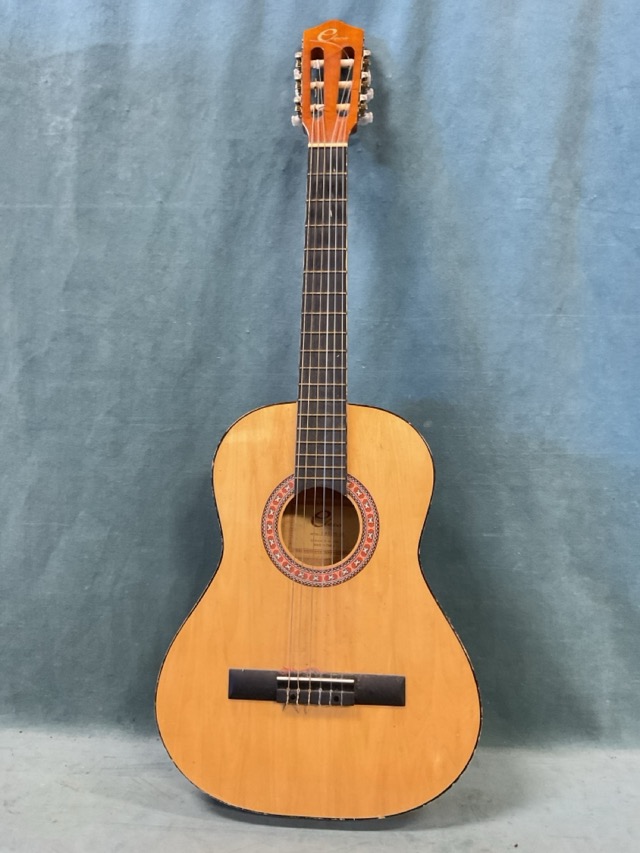 A Eleca classical nylon string guitar with transfer decoration to sound hole and cedar body. (36.25in)