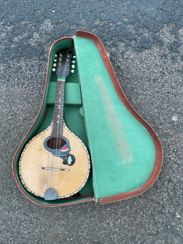 A cased Italian eight-string mandolin with inlaid ebonised panel framing shaped soundhole, having pine body with chequered inlaid purfling, the neck with brass frets & machine heads. (24in)