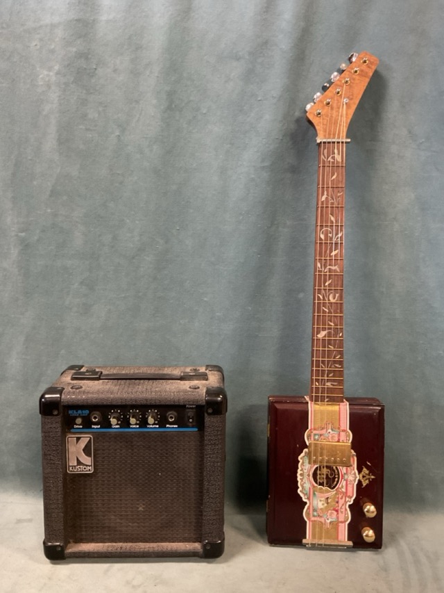 A cigar box six string guitar with mother-of-pearl inlaid neck and angled headstock, having single brass pick-up and twin control knobs, together with a Kustom 40w amplifier. (2)