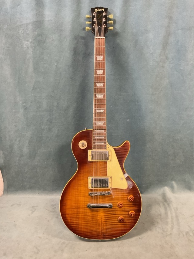 A cased Gibson style Les Paul electric guitar with mother-of-pearl inlaid neck, twin pick-ups, figured mahogany body, ivory coloured guard, etc. (40in)
