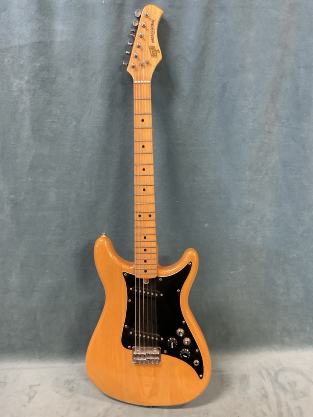 A cased Hondo II electric guitar with waisted cedar body, black guard, brass frets, angled headstock, etc - as new. (39in)