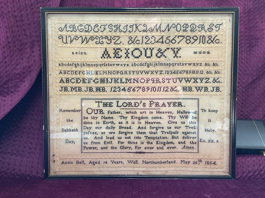 An 1854 sampler by Annis Bell from Wall, Northumberland aged 14, sewn in black wool with alphabet, numbers, vowels and prayer, laid down and hogarth framed. (18.75in x 16.75in)
