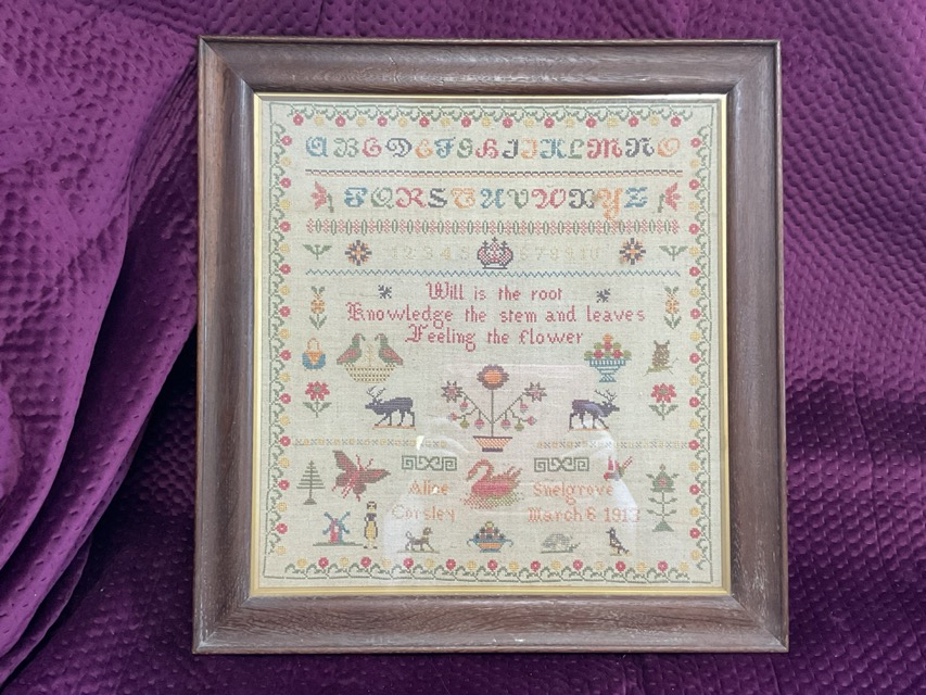 A colourful 1913 sampler sewn by Alice Corsley Snelgrove, with alphabet & numbers above motto with birds, butterflies, flowers, windmills, trees, deer, owls, etc., the panel framed by floral border, oak framed with gilt slip. (15.5in x 16.5in)