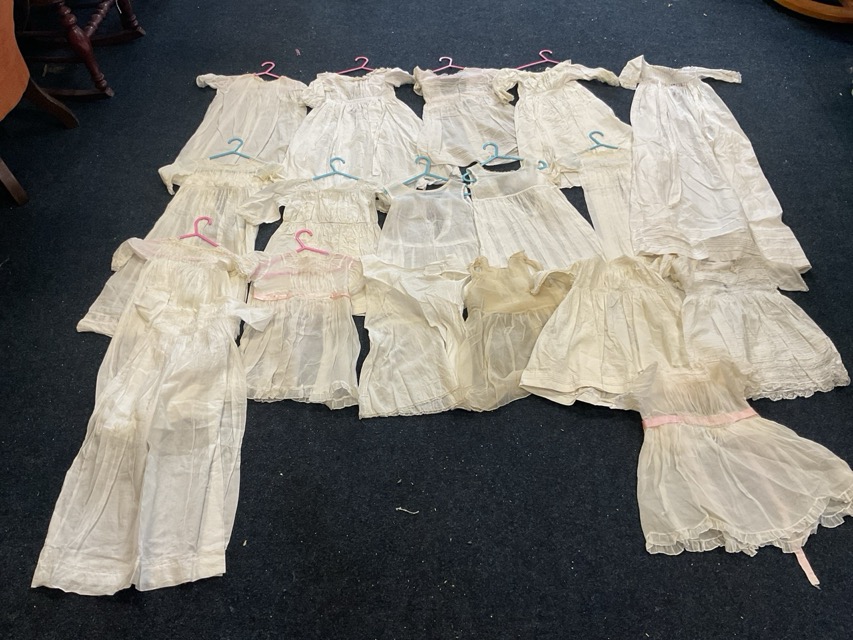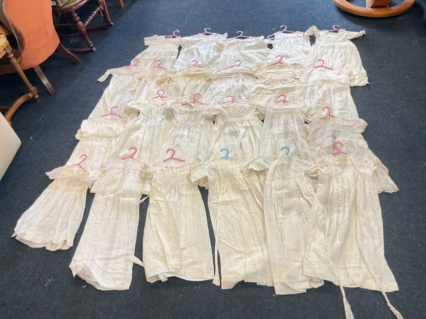 A large collection of Victorian and later babies dresses - silk, cotton, wool, rayon, nylon, lace, broderie anglaise, knitted, crochret, embroidered, smocked, etc. (approx 55)