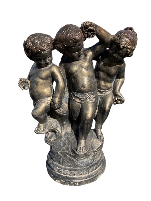 A painted composition stone garden sculptured group of three cherubs with mushrooms, standing on naturalistic moulded plinth with circular base. (22in x 16in)