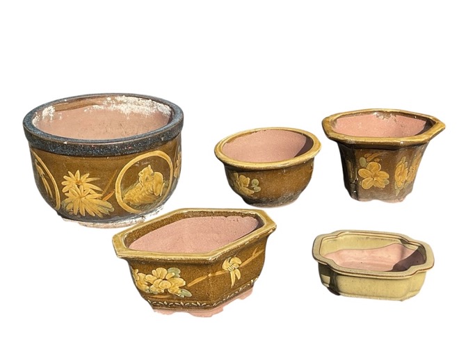 Five miscellaneous terracotta garden plant pots with floral decoration on brown glazed ground - some with birds & animals. (5)