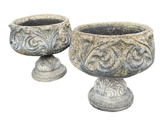 A pair of composition stone garden urns cast with leaf scrolling, the vessels of tulip shape on circular plinths. (18in x 17.5in) (2)