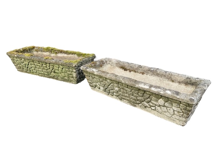 A pair of rectangular composition stone flared garden troughs cast with cobblestone type sides. (27.75in) (2)