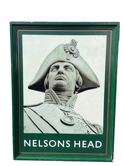 A modern swinging rectangular pub sign with metal panel and moulded frame, having image of the captain above Nelsons Head title, the top rail with iron bracket. (35.5in x 47.25in)