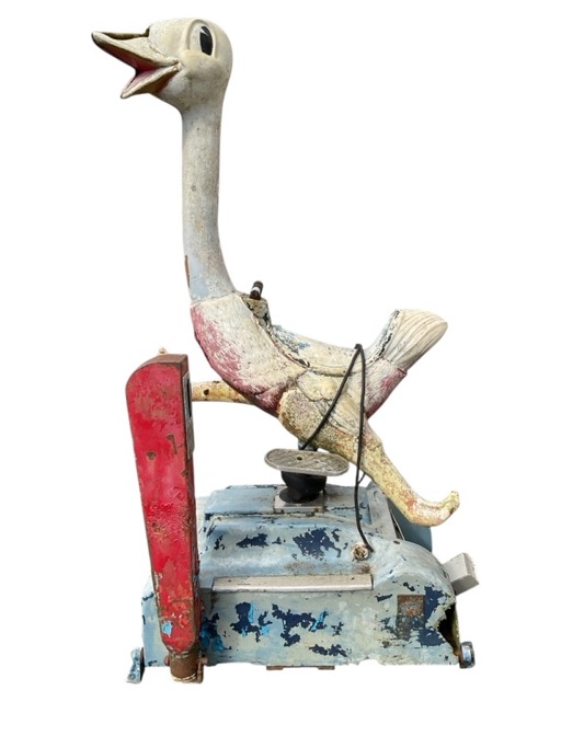 A lifesize mechanical ostrich fairground penny ride, the seat with handle and foot rests, raised on tiered plinth having money slot to column. (A/F) (28in x 39.5in x 72in)