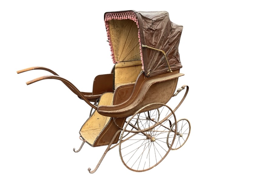 A Victorian perambulator with folding hood above a rear facing button upholstered seat and curved coach lined body and footrest with bentwood barrow handles and spoked wheels with solid tyres. (53in x 50in)