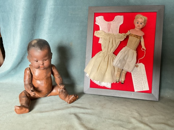 An English 1860s wax headed doll with straw stuffed body and composition limbs - 12in; and a 20s Armand Marseille Dream Baby doll with bisque head mould 351/7K on jointed composition body - 15.5in. (2)