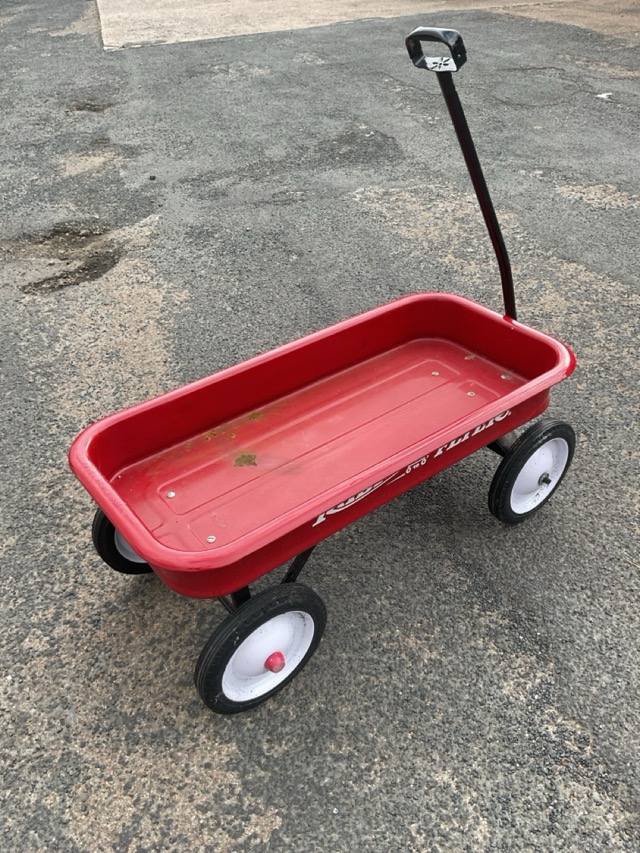A Radio Flyer metal cart with rounded rectangular tray body and two-wheeled front bogey with hinged pulling colum. (40in x 17in x 14.5in)