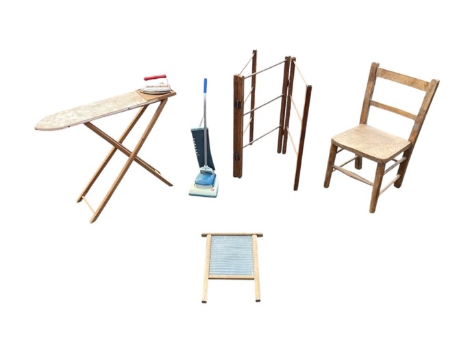 A toy ironing board & iron, a clothes airer, washboard and Hoover upright vacuum cleaner; and an elm childrens chair with dished seat raised on tapering cylindrical legs joined by stretchers. (6)