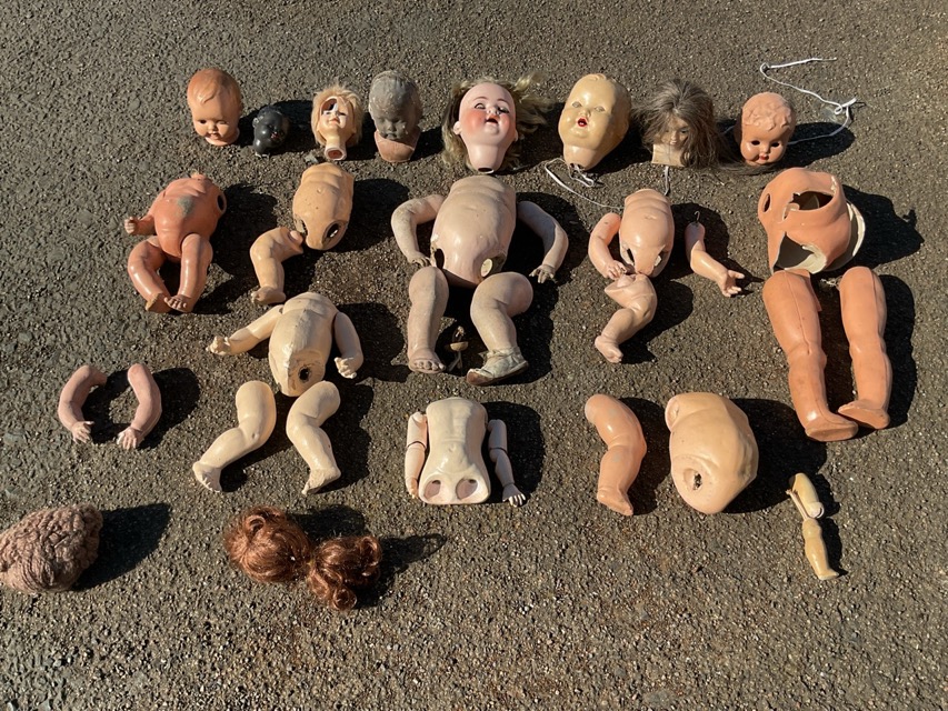 Miscellaneous doll components - a porcelain Heubach & Koppersdorf head with sleep eyes, porcelain heads, composition heads, composition bodies with limbs, odd arms, legs, wigs, etc. (A lot)