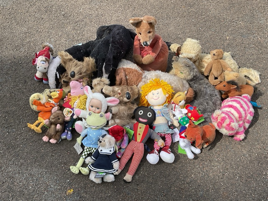 A collection of thirty soft toys and pyjama cases - rag dolls, a golly, Bagpuss, a fox doorstop, bears, horses, rabbits, koalas, dogs, etc. (30)