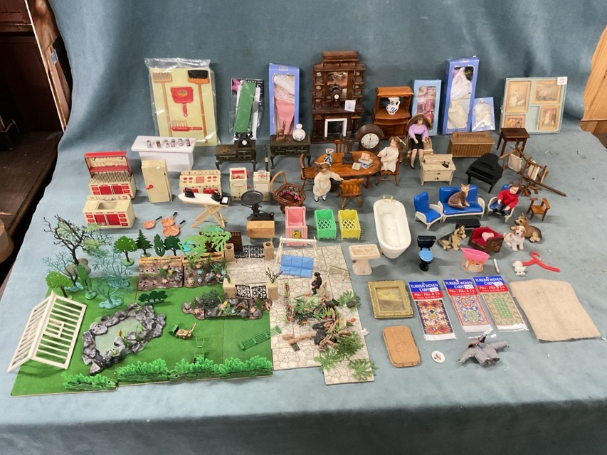Miscellaneous dolls house furniture and accessories - 50s tinplate kitchen furnishings, a garden with lawns, borders, a pond, a patio, trees, chairs, tables, a fireplace, miniature ceramics, books, ornaments, framed pictures, figures, animals, rugs, etc. (A lot)