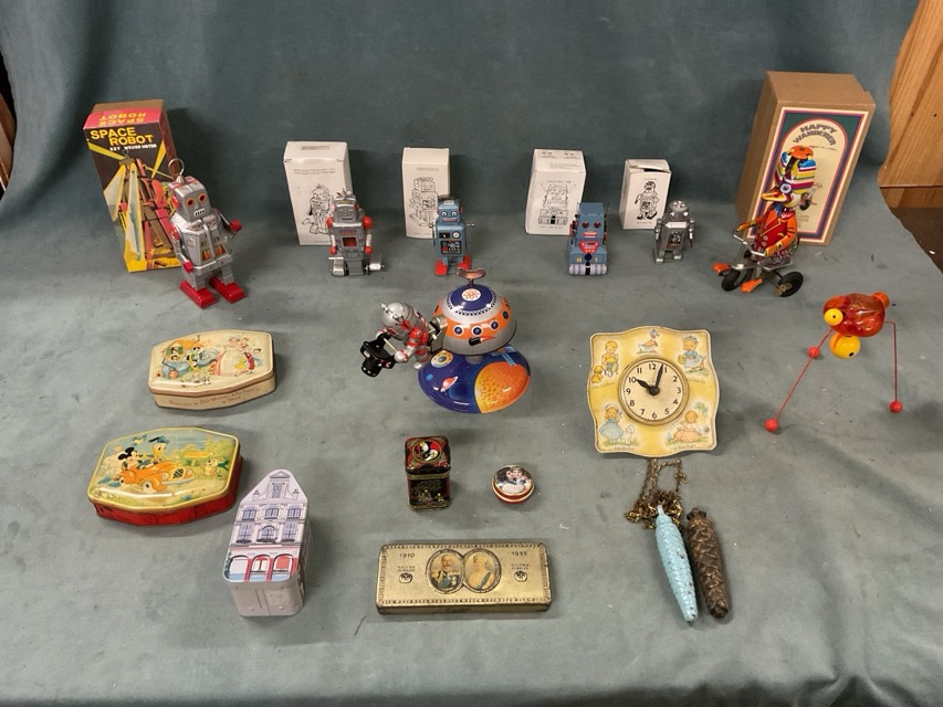 A collection of tins and clockwork toys - boxed robots, a boxed Happy Wanderer duck on a tricycle, a jiggling tripod alien, a Mars-1 flying saucer and robot, a Chad Valley nursery rhyme wall clock, Horner toffee tins, a 1935 jubilee chocolate tin, etc. (15)