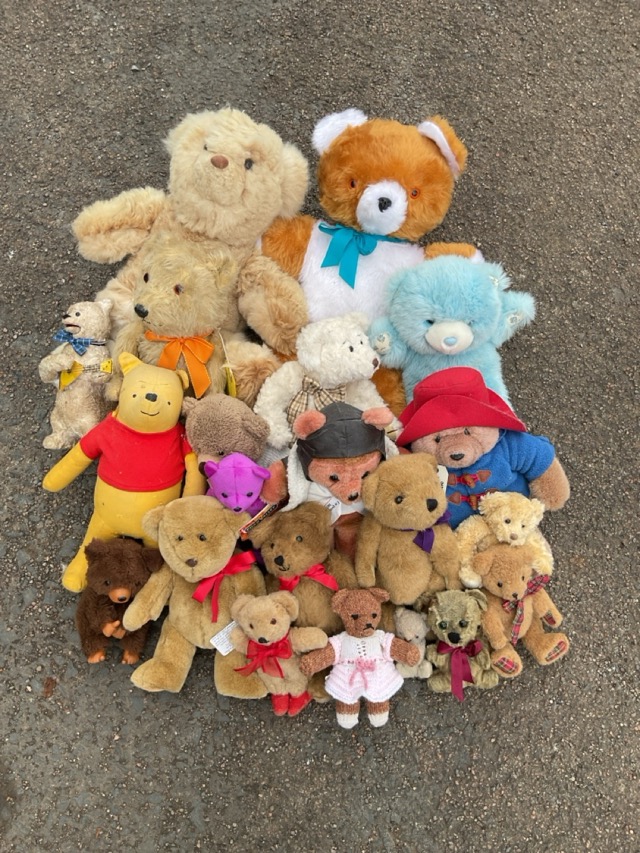 Miscellaneous C20th teddies - Winnie the Pooh, Paddington, Carebear, a Chiltern musical bear, a bear made from angora skin, Anne Wilkinson designs, Russ Berrie & Co, etc. (21)