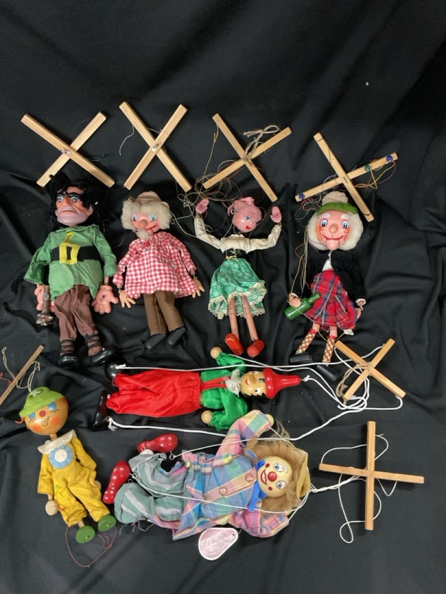 Five Pelham puppets - Mr MacBoozle, a black haired Mitzi, the Farmer, the Giant, and a clown; a painted wood Pinocchio with pointed red hat; and a Discoveries clown marionette with painted face. (7)