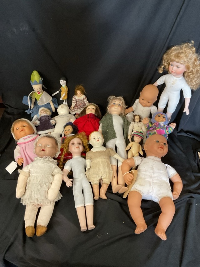 Eighteen dolls - porcelain, babies, costume, canvas bodied, a flapper, composition, etc. (18)