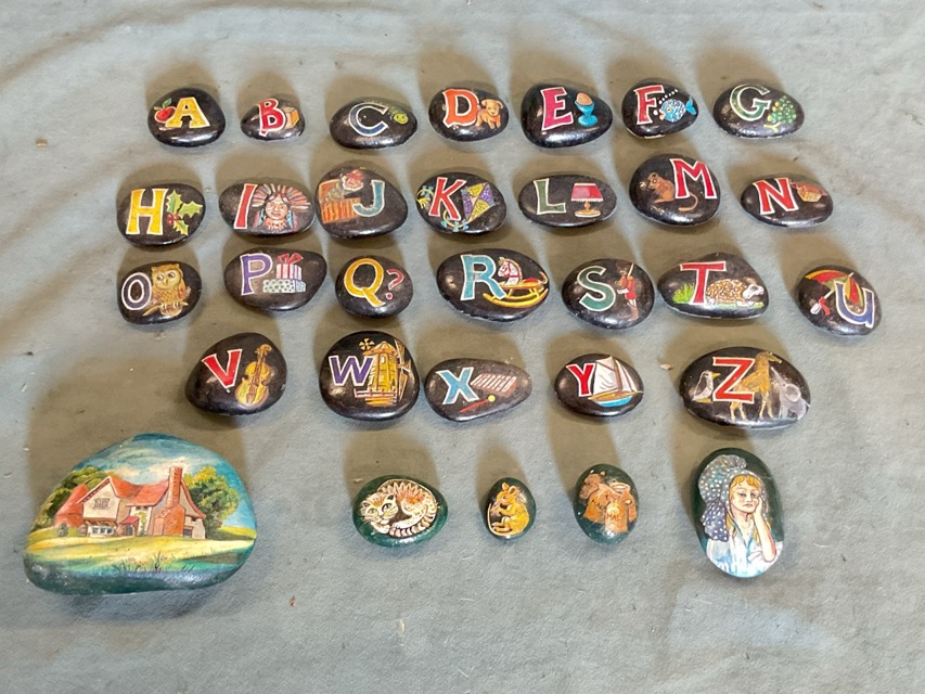 Norris Walker, painted pebble alphabet - each letter with an appropriate object depicted beside it, and five further painted pebbles depicting a farmhouse, a cat, a mouse, sacks of malt, and a girl. (31)