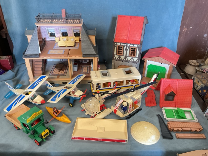 A collection of Playmobile sets - Albatross airplanes, police & air rescue helicopters, a truck, a citybus with passengers, a kayak, a mansion with furnishings; and spare components for buliding - a mock Tudor house, shed, castle, igloo, petrol station, etc. (A lot)