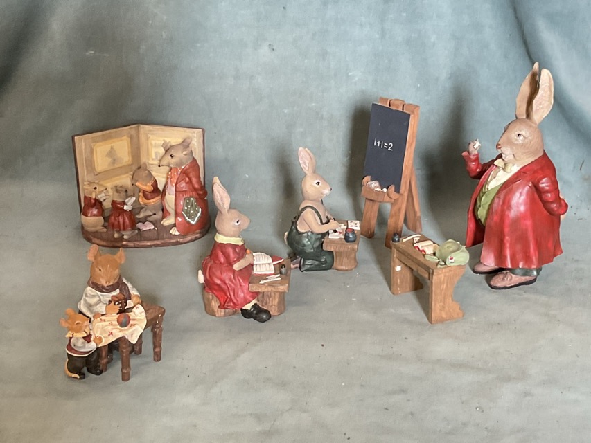A Sculptures UK handpainted figure group of a mouse school with teacher; another figure group of a mouse father and son at a table; and rabbit classroom group with teachers desk, teacher, blackboard and two pupils. (7)
