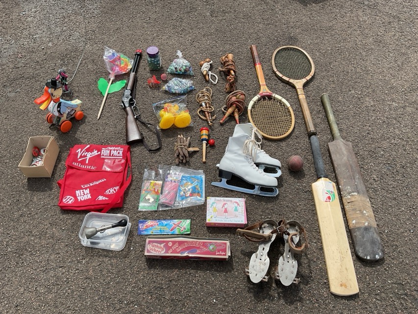 Miscellaneous toys - skipping ropes, skates, cricket bats, balls, rackets, glass marbles, gag jokes, a toy gun, glider planes, pencils, a bag, rubber ducks, Walkers Tazo collectors chips, a pinwheel, a horn by rivet, etc. (A lot)
