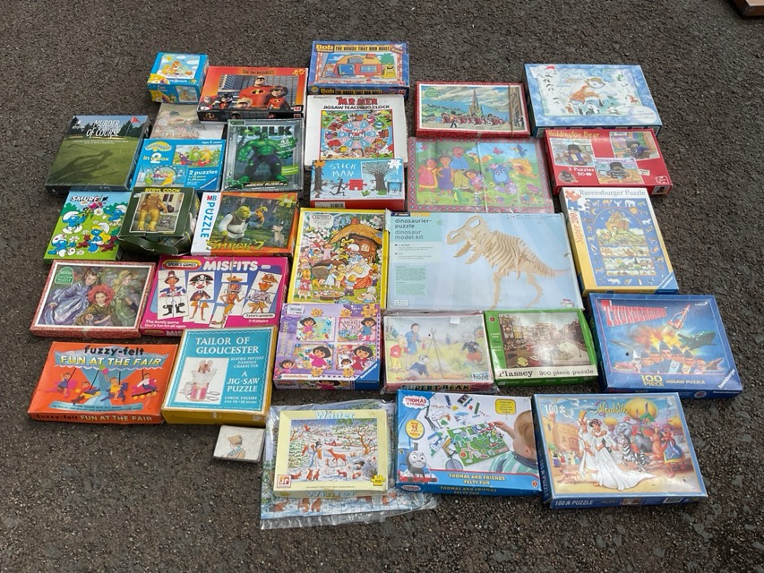 A collection of jigsaw puzzles - landscapes, illustrations, Beatrix Potter, Dora the Explorer, Disney, Paddington, Thunderbirds, Shrek, CareBears, a 3D dinosaur, a Murder of Course puzzle, ranging from 25 - 1000 pieces, etc. (31)