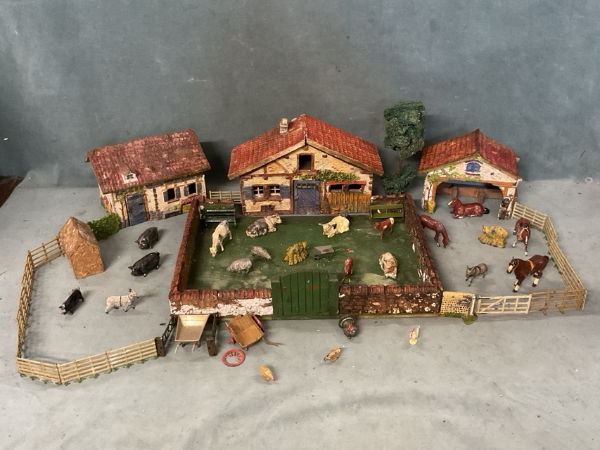 A farm set with cottages, a stable, a paddock with metal fences, farm tools & animals - horses, chickens, cows, sheep, pigs, a turkey, a donkey, a goat, etc. (A lot)