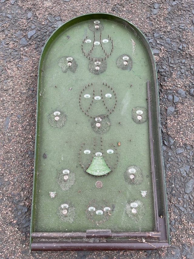 A 1950s Corinthian Abbey Model bagatelle board, the canvas covered panel with spring cue and variable scores, having original label with rules. (29.5in)
