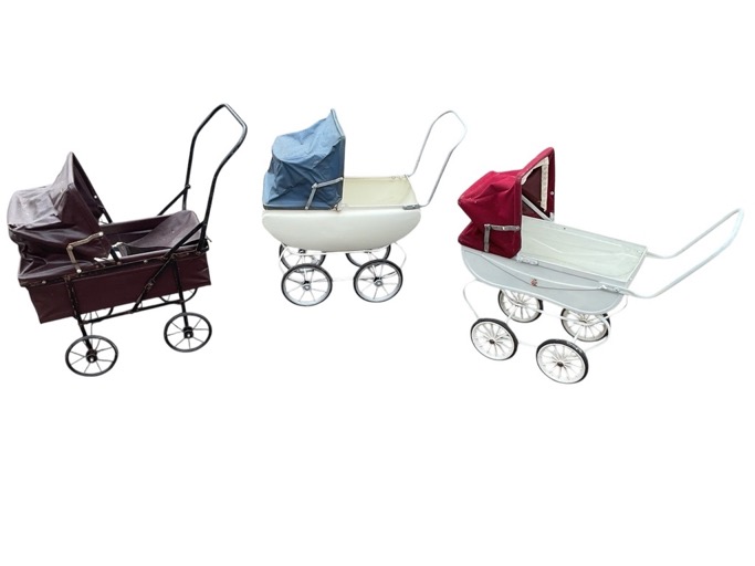 A 1920s Tri-ang dolls pram, with black metal frame and faux lather canopy; another later white painted Triang pram; and a third unmarked with maroon cover and sprung frame. (3)