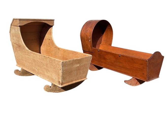 A pine childs cradle, with arched head board with dovetailed body, raised on rockers; and another pine cradle with panelled cover, raised on scroll carved rockers. (2)